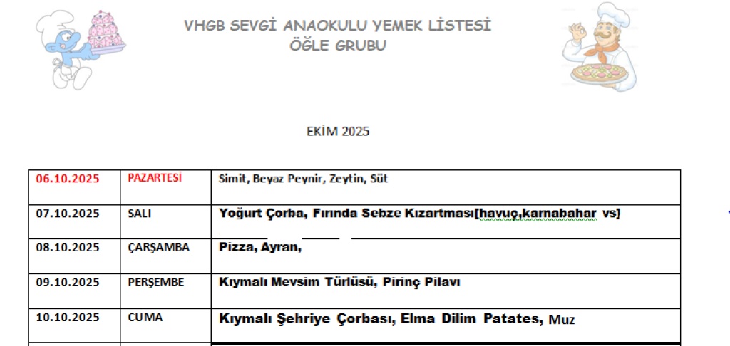 VHGB SEVGİ ANAOKULU EKİM AYI YEMEK LİSTESİ